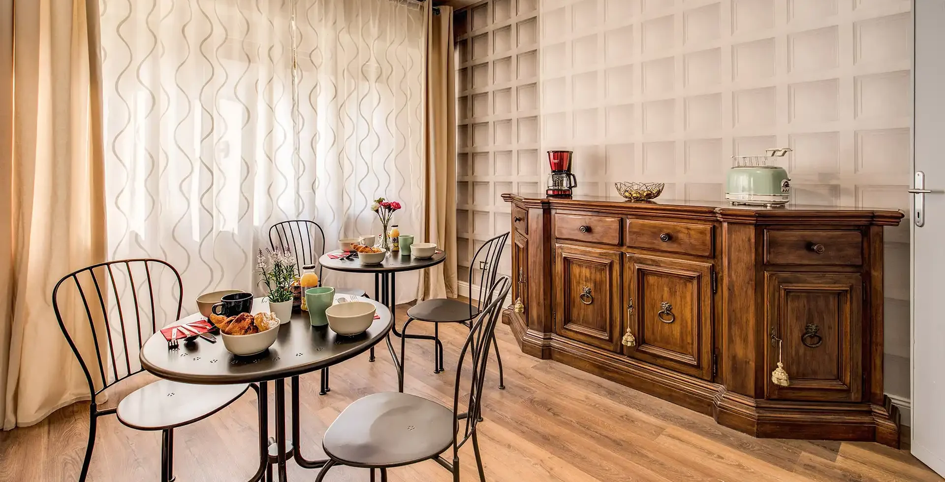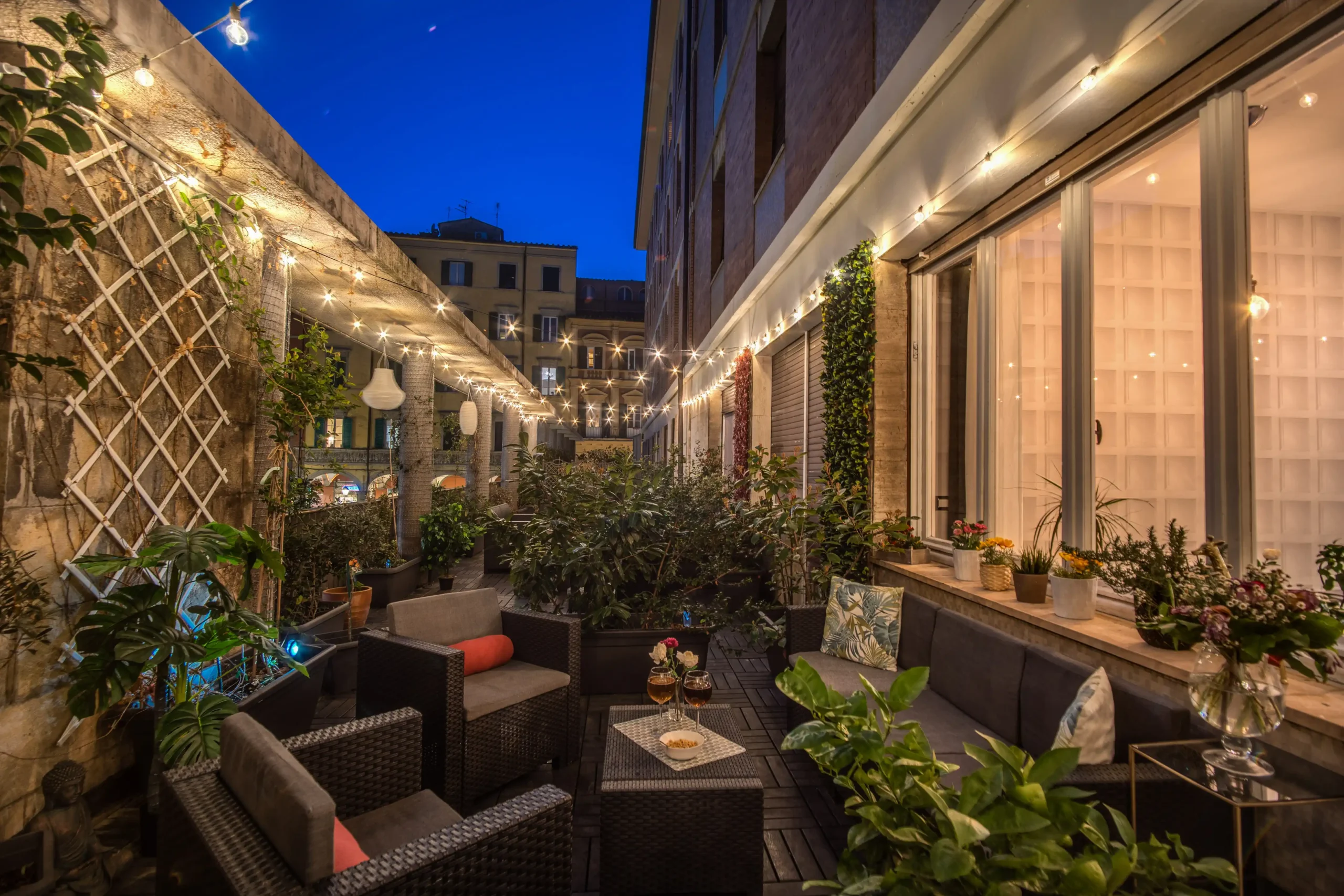 Each bedroom is inspired by a different flower, bringing a touch of color and serenity that recalls the lush garden surrounding the house. At the heart of the guesthouse you’ll find a spacious lounge terrace, filled with greenery and flowers, where you can unwind while enjoying panoramic views of Pisa’s historic center.